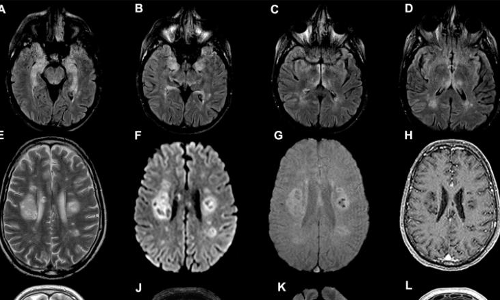 Hầu hết bệnh nhân bị viêm não được chẩn đoán là viêm tủy lan tỏa cấp tính, hiếm gặp và đặc hiệu (ADEM). Biểu hiện lâm sàng bao gồm hội chứng thần kinh, giảm hoặc mất thị lực, liệt nửa người hoặc liệt tứ chi.